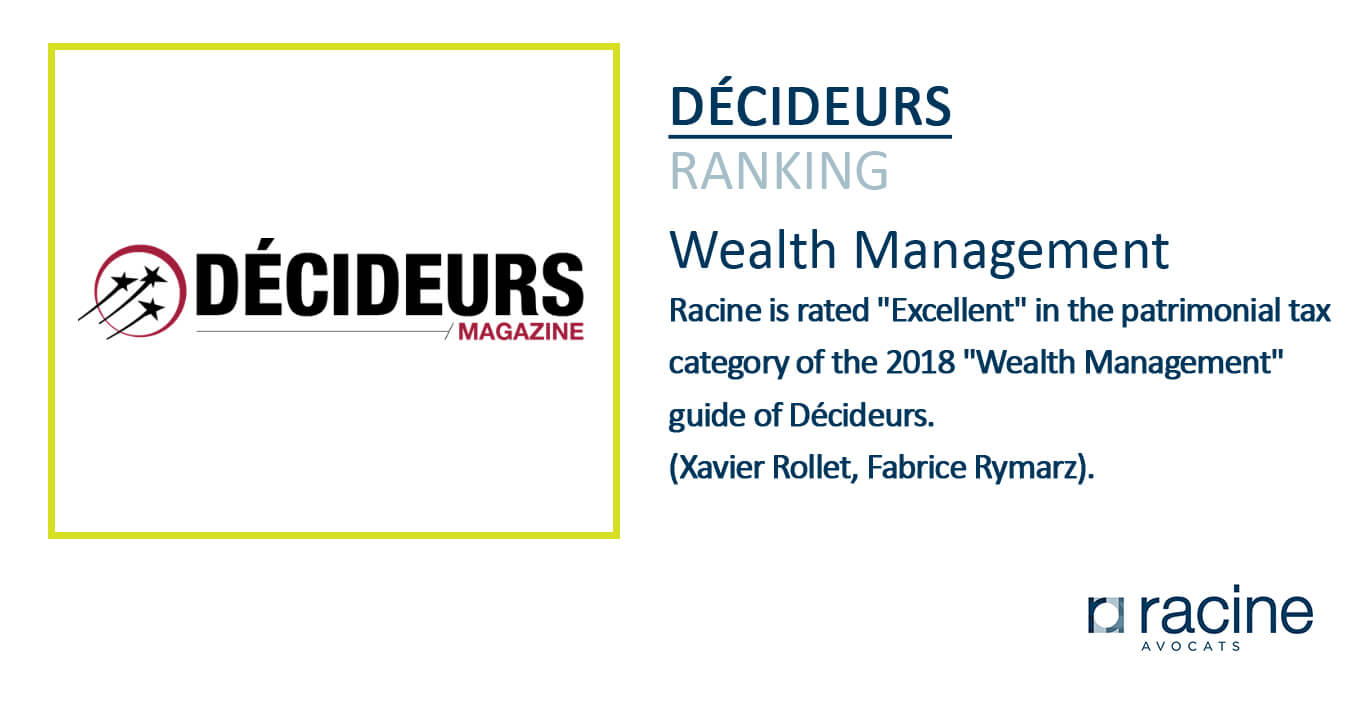 Racine is rated “Excellent” in the patrimonial tax category of the 2018 “Wealth Management” guide of Décideurs (Xavier Rollet, Fabrice Rymarz).
